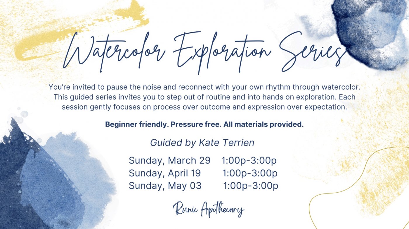 This three part watercolor series offers a gentle introduction to watercolor through experimentation and discovery. It is designed to be welcoming and beginner friendly, with plenty of room to explore at your own pace. The only thing required is your presence.