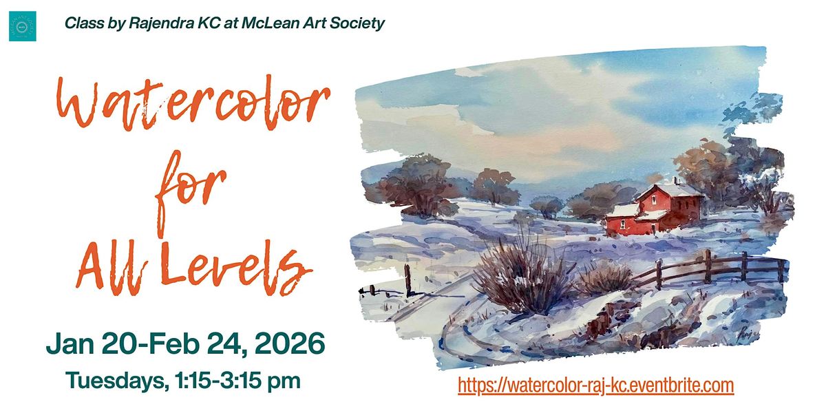 6 classes. Learn to capture the transparent quality of watercolor, including still life and landscapes. Individualized instruction accommodates students from beginners to the very experienced. Supply list provided to registereds students. Classes are held at the McLean Art Gallery at the Chesterbrook Shopping Center on Tuesdays, 1:15 to 3:15 pm on January 20, 27, and February 3, 10, 17, 24.