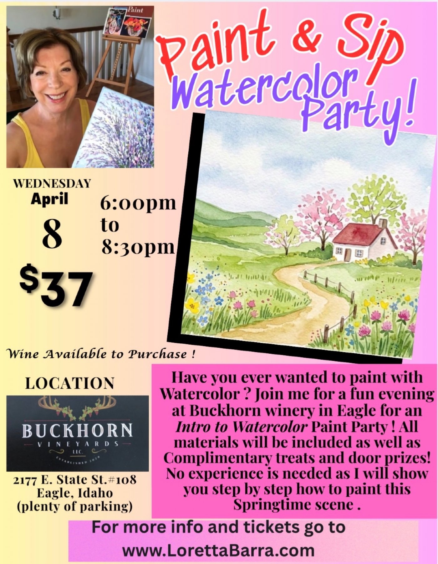 Unleash your creativity at the Watercolor Paint and Sip event hosted by Loretta Barra!
