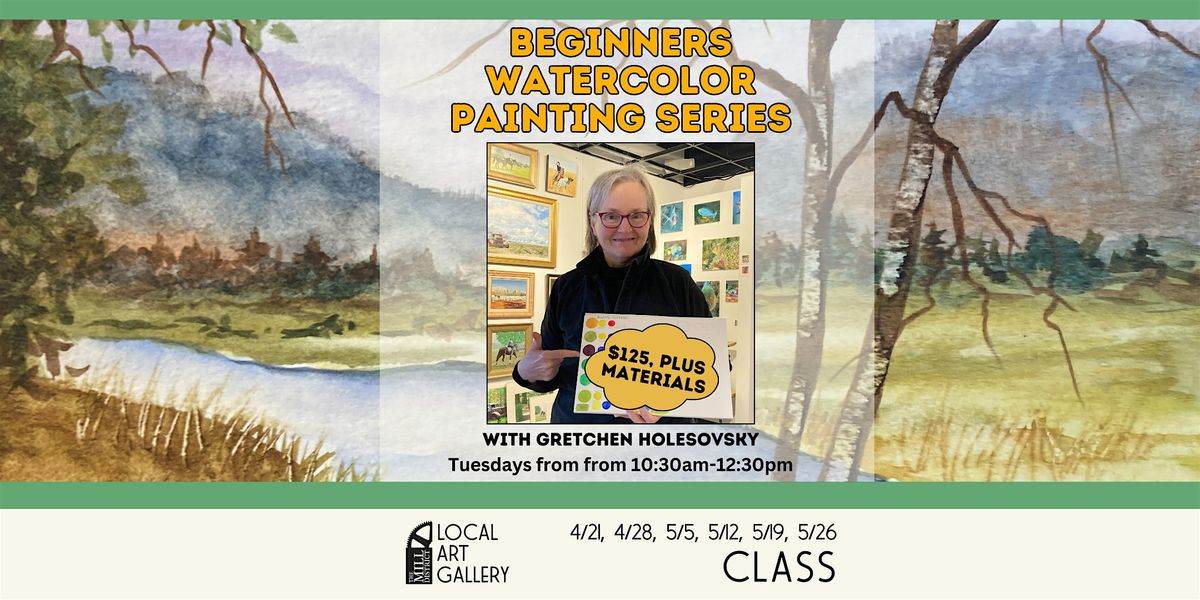 Join Belchertown artist, Gretchen Holesovsky, at The Mill District Local Art Gallery for her expanded Beginner Watercolor Class. This 6 week course is held on Tuesdays from 10:30- 12:30 on 4/21, 4/28, 5/5, 5/12, 5/19, & 5/26. This course focuses on color, color mixing, water to pigment ratio and use of brushes. Students will also learn watercolor techniques and applications.