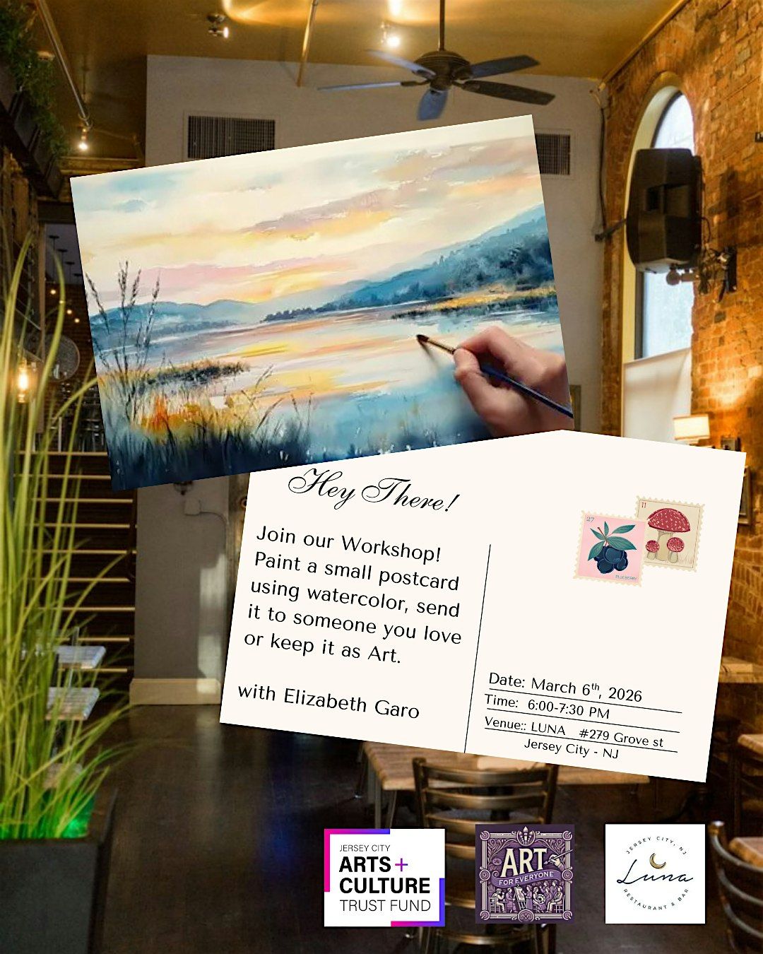 Explore watercolor techniques while creating a small landscape postcard. Bring a image that inspire you, or create it, with Elizabeth Garo.