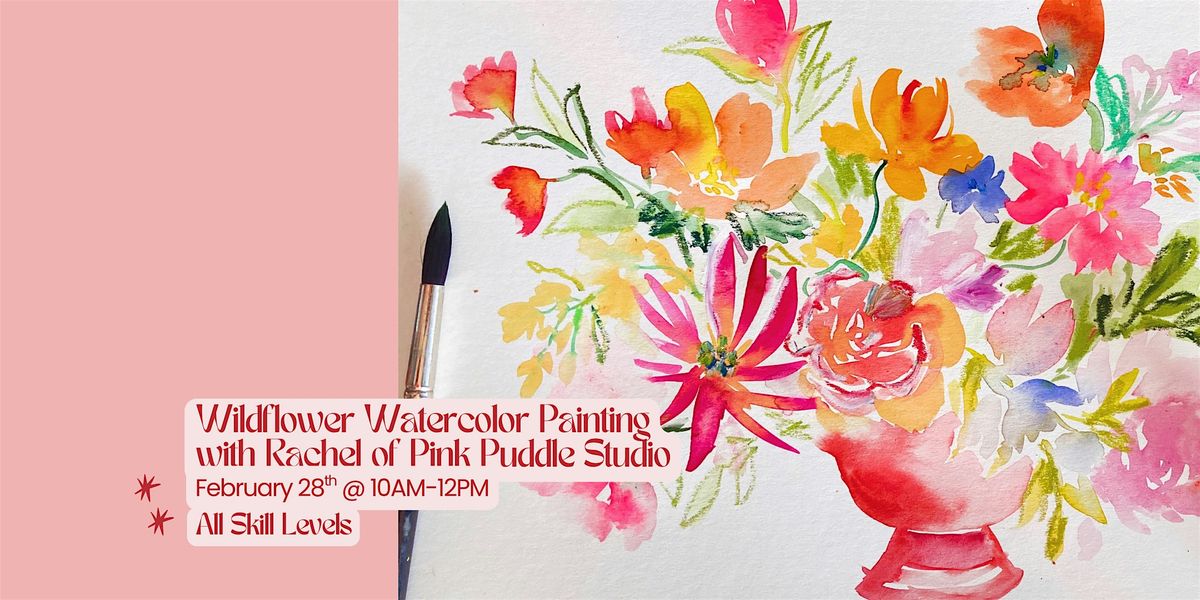 Join Rachel, of Pink Puddle Studio, on Saturday February 28, 2026 at 10am on the Botanica Patio at The Farm at South Mountain for a watercolor workshop! We will be painting whimsical wildflowers in a still life form but with looser brushstrokes and added texture with oil pastel. All skill levels are welcome!