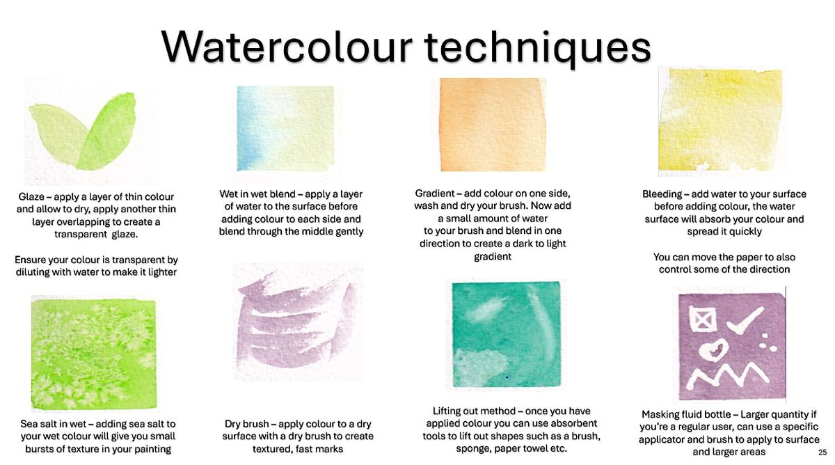 Throughout this workshop you will explore watercolour painting techniques, brushes and paper, colour mixing and so much more. You will be introduced to a range of materials from student grade, to professional artist quality materials and papers. Most of all, we want everyone to feel relaxed, get to know each other and be creative.