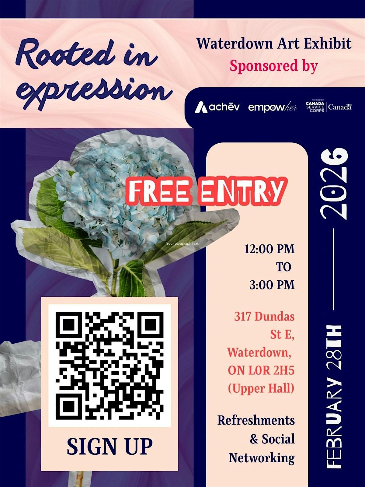 Hello everyone! We are hosting a free, interactive, and family bonding event for you and your kids to take part in over the weekend! EmpowHER, a youth-led non-profit organization, is hosting a free, in-person interactive art exhibit that celebrates local Waterdown artists and creativity within the community.