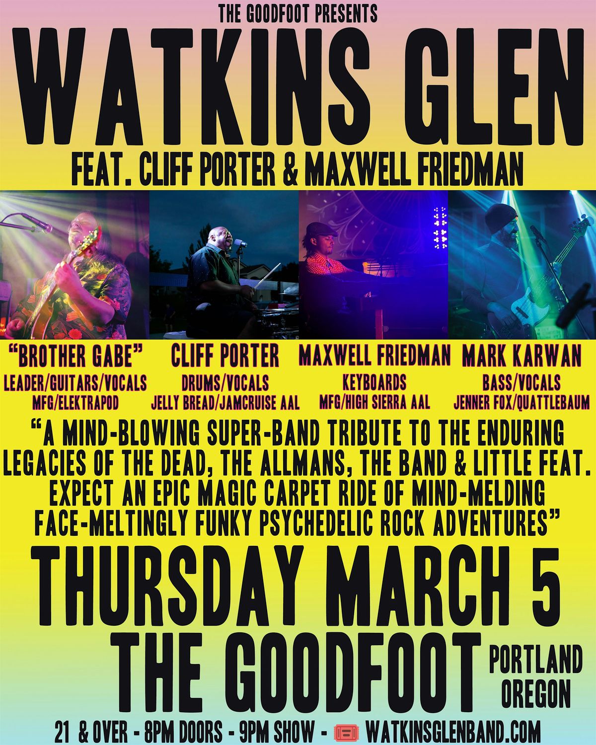 WATKINS GLEN returns to the Goodfoot with their dazzling mashup tribute to the Grateful Dead, the Allman Brothers Band, The Band and Little Feat. For this tour, leader “Brother Gabe” Johnson has assembled a special super-group of truly world-class players – Drummer & singer Cliff Porter (Jamcruise AAL, Jelly Bread, Joe Marcinek Band), Hammond-endorsed organist Maxwell Friedman (MFG, High Sierra AAL) and bassist Mark Karwan (Jenner Fox, Quattlebaum) to deliver an extremely danceable and deeply soulful show for you. Don’t miss this amazingly magical night of spirit and song.