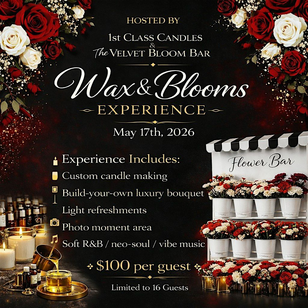 Join us for the Wax & Blooms Experience, an intimate hands-on event where you will create your own custom candle and design a luxury bouquet. Enjoy light refreshments, a curated photo moment, and smooth R&B and neo soul vibes. This exclusive experience is limited to 16 guests. Powered by 1st Class Candles and The Velvet Bloom Bar.