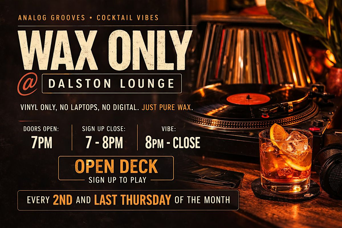 Wax Only is a bi-weekly night dedicated to pure analog sound. No laptops. No USBs. Just turntables, records, and real DJs. Expect a carefully curated selection of deep cuts, soulful grooves, and timeless classics spanning soul, jazz, funk, Afro, house, and more.