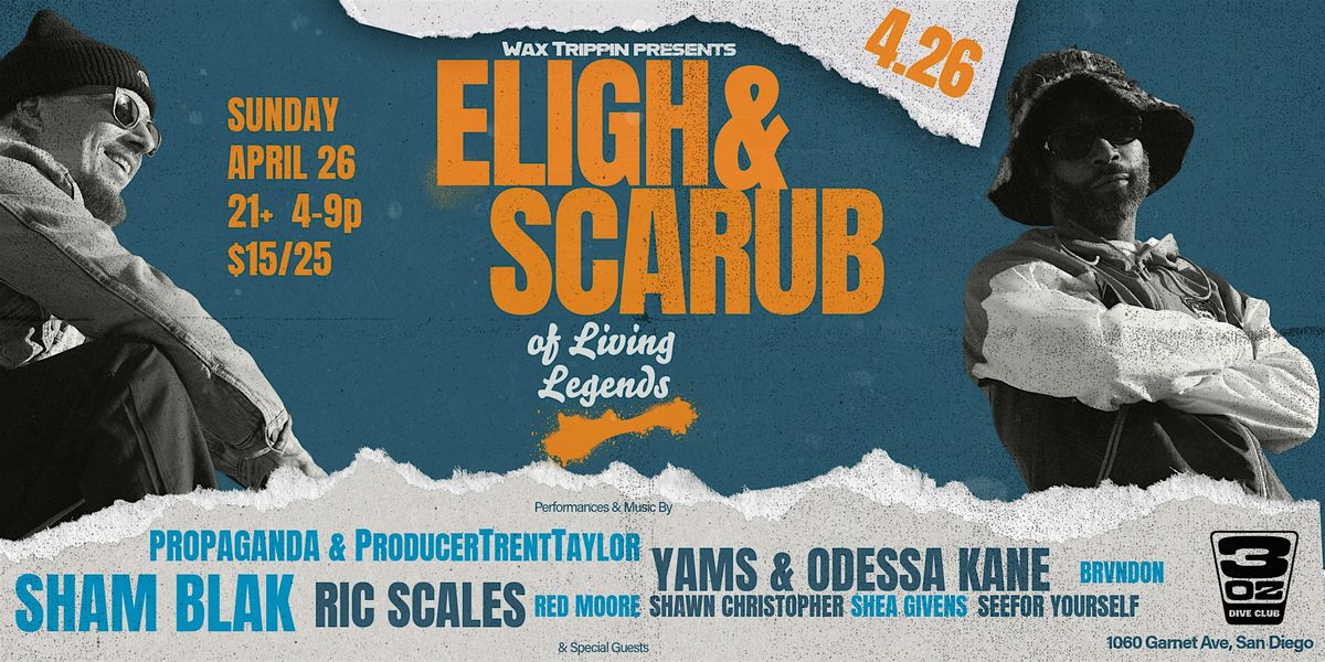 Get ready for an early, intimate evening with Eligh & Scarub of the legendary Living Legends crew! Join us at the 3OZ Dive Club on April 26, 2026 at 4:00 PM (PDT) for some dope vibes and live tunes. This is the perfect chance to catch these hip-hop icons up close and personal. Don’t miss out on an epic evening filled with great music and good times!
