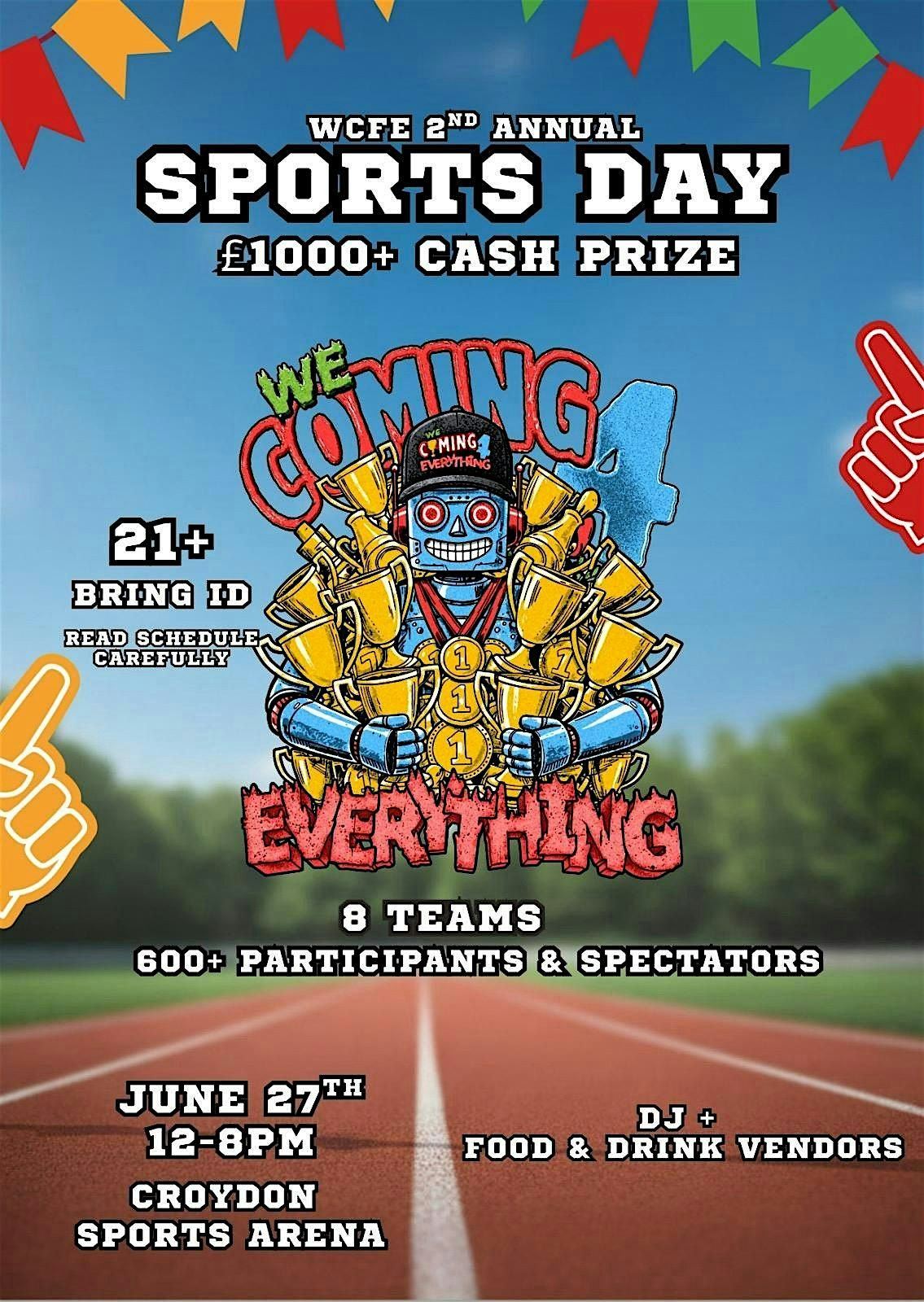 By purchasing a ticket, registering, attending, or participating in the WCFE Sports Day (“the Event”) on June 27th, you confirm that you have read, understood, and agreed to the following Terms and Conditions and Waiver of Liability.