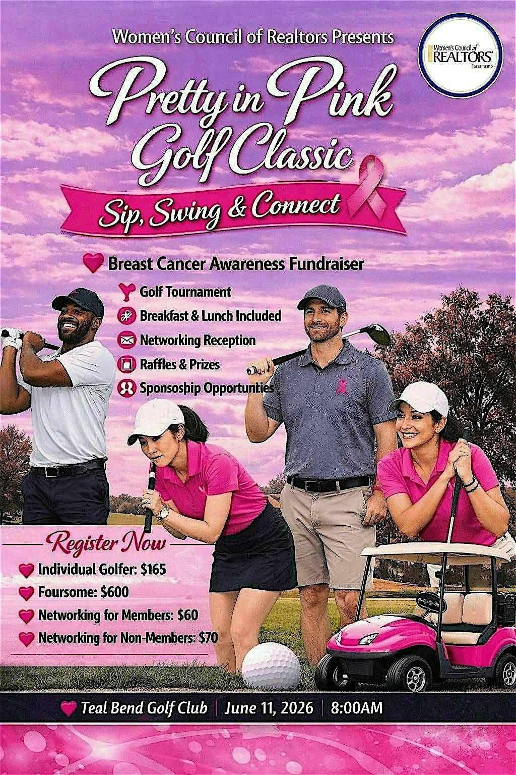 Get ready for a fun and fabulous day at WCR's Pretty In Pink Sip, Swing, and Connect Golf Tournament! This in-person event is all about good vibes, great company, and a splash of pink flair. Whether you're coming to mingle, dance, or just soak up the atmosphere, it's the perfect way to spend your evening. Put on your coolest pink outfit and join us for some unforgettable moments!