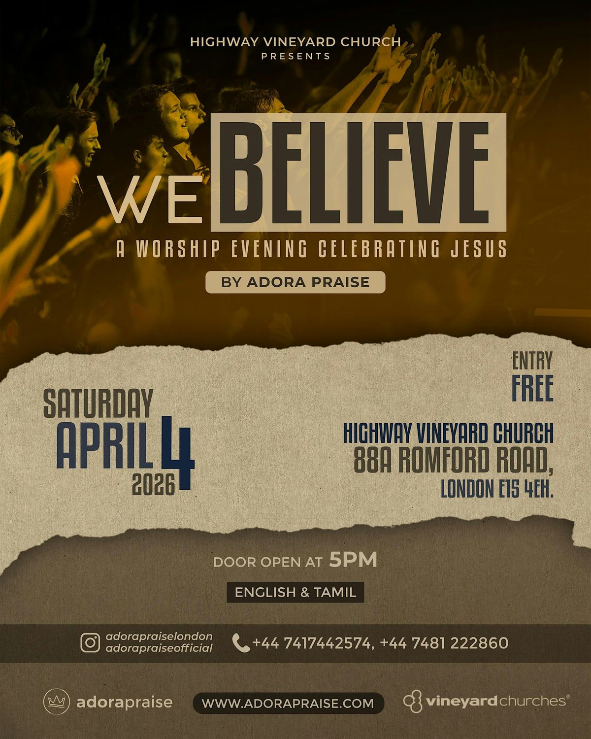 You’re warmly invited to an evening of English & Tamil worship, praise, and encouragement at Highway Vineyard Church on 4 April 2026 at 5:30 PM (BST).