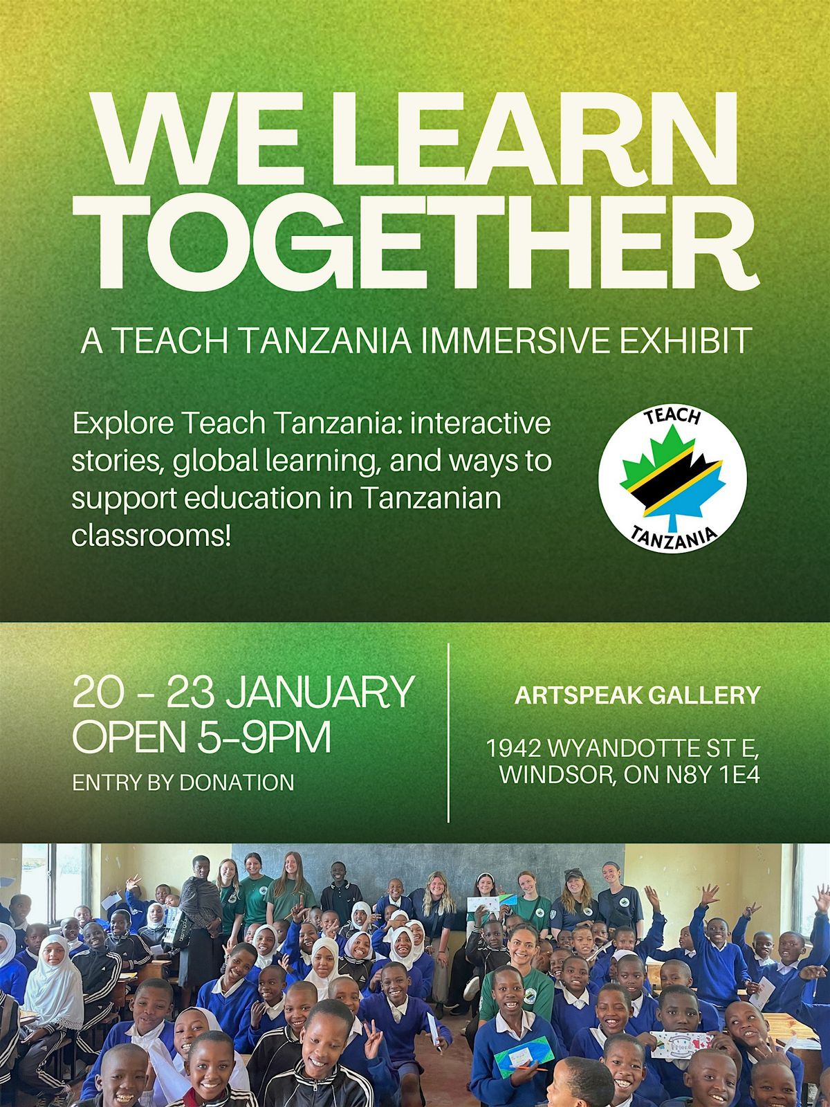 This immersive gallery invites guests to explore the University of Windsor’s Global Community Engagement Program through the lens of Teach Tanzania, highlighting the power of education and cross-cultural collaboration. Visitors will move through a series of interactive stations featuring audio-visual stories, classroom moments, and reflections from past Teach Tanzania participants. Each engagement point is designed to show how community-driven learning, partnership, and global citizenship shape meaningful educational change. Throughout the gallery, guests will have opportunities to support the upcoming Teach Tanzania engagement trip, helping strengthen ongoing initiatives in Tanzanian classrooms and communities. Together, we celebrate the impact of Teach Tanzania and the connections that unite our global community.