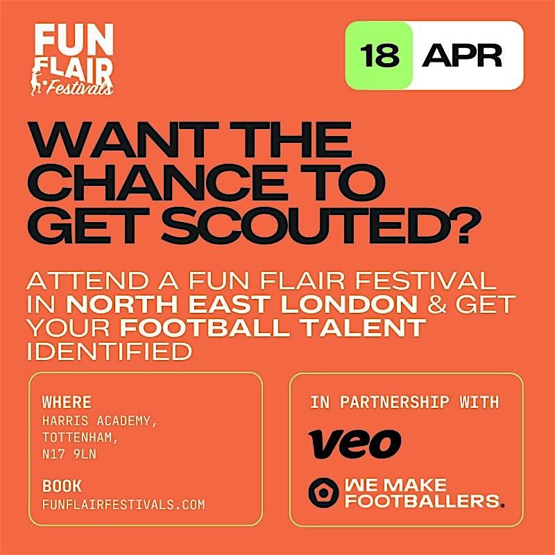 We Make Footballers are hosting a Fun Flair Festival in North East London (Tottenham) on Saturday 18th April. The event will be filmed using a VEO camera and the footage will be sent to professional club scouts. These events are a great opportunity for players to find pathways into professional clubs.
