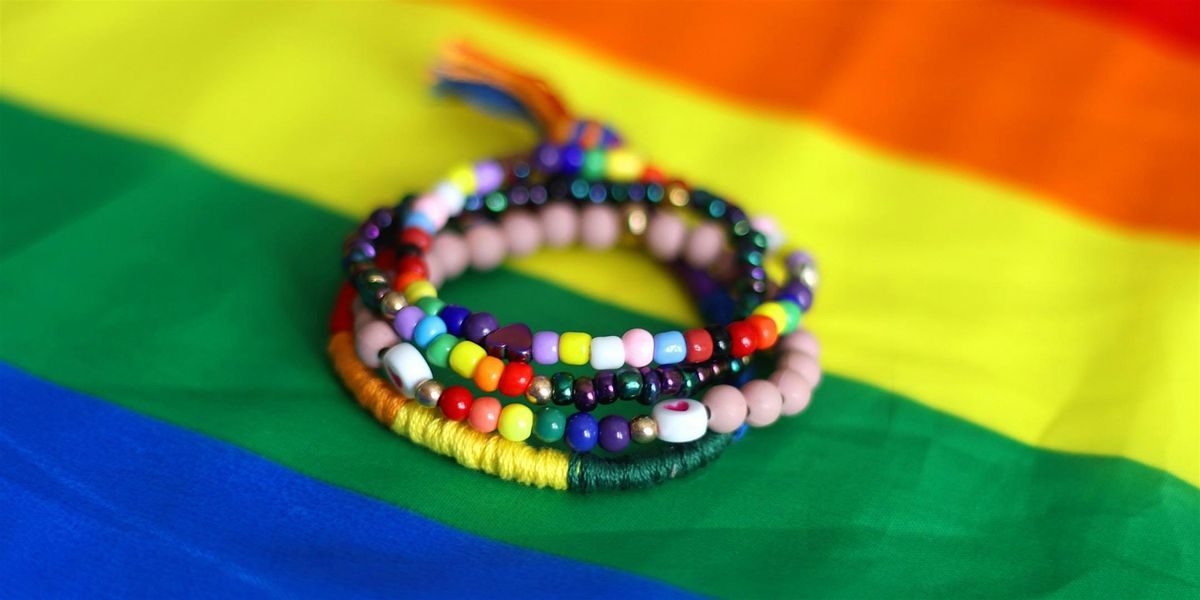 Image: Brightly coloured beaded and woven bracelets sit atop a rainbow flag.