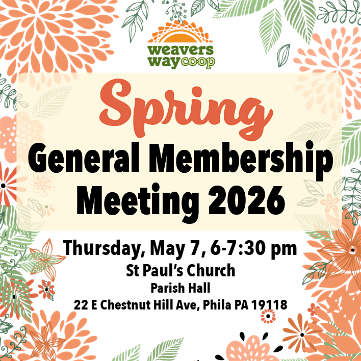 Join your fellow co-op member and how your co-op loce at Weavers Way’s Spring 2026 General Membership meeting on May 7th from 6 to 7:30 pm in the Parish Hall at St. Paul’s Church in Chestnut Hill. We will have live music, tasty eats and fun activities for kids. Our GM Jon Roesser will share the Co-op’s business update, the latest on our renovation plans for the Chestnut Hill store and the board election results. Working members can earn 2hrs for attending the Genenral Membership Meeting. Please RSVP today!