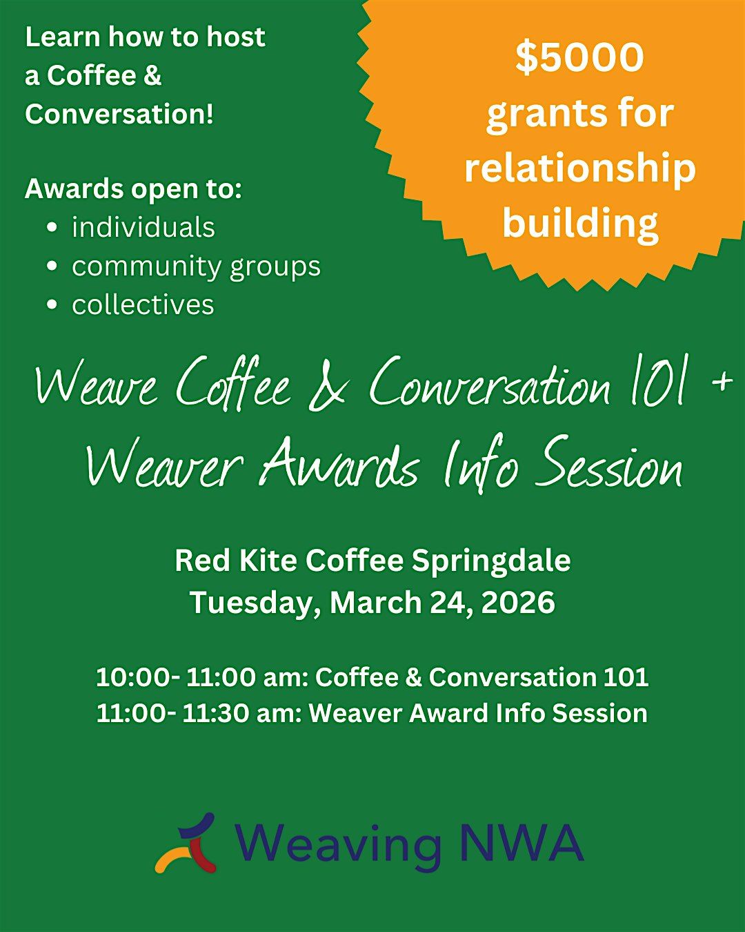 Join us for a Weaving Us Coffee & Conversation 101—a welcoming gathering hosted by Weaving NWA designed to help you learn how to host your own neighborhood Coffee & Conversation.