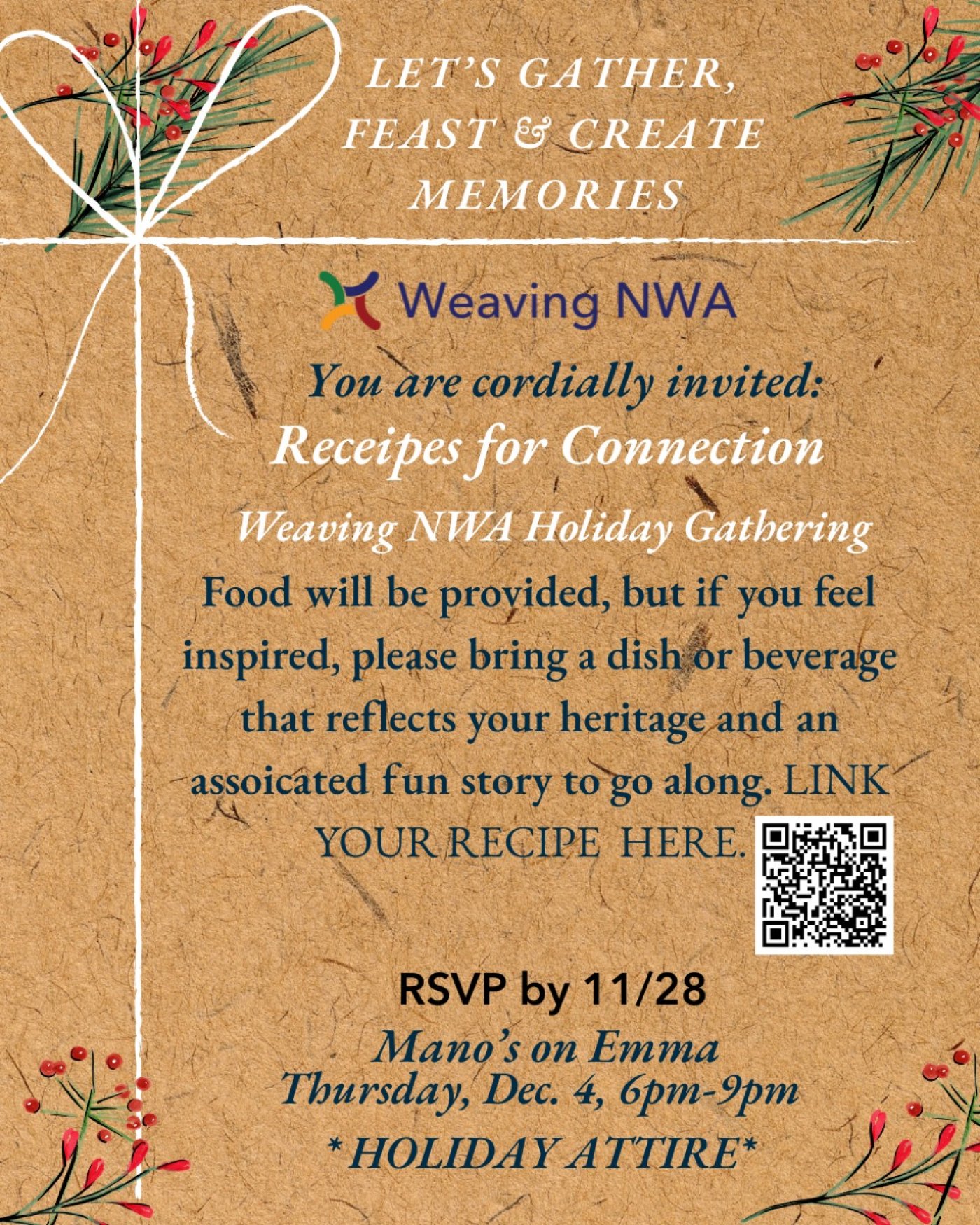 A traditional holiday spread will be provided, and we warmly invite guests to contribute a dish from their own heritage to share. Whether it’s a recipe inspired by childhood, a meal that brings you comfort, or a flavor that tells a story, we’d love to experience it with you. In partnership with the Ozark Story Project, we invite you to upload a picture, story, or recipe in advance here.