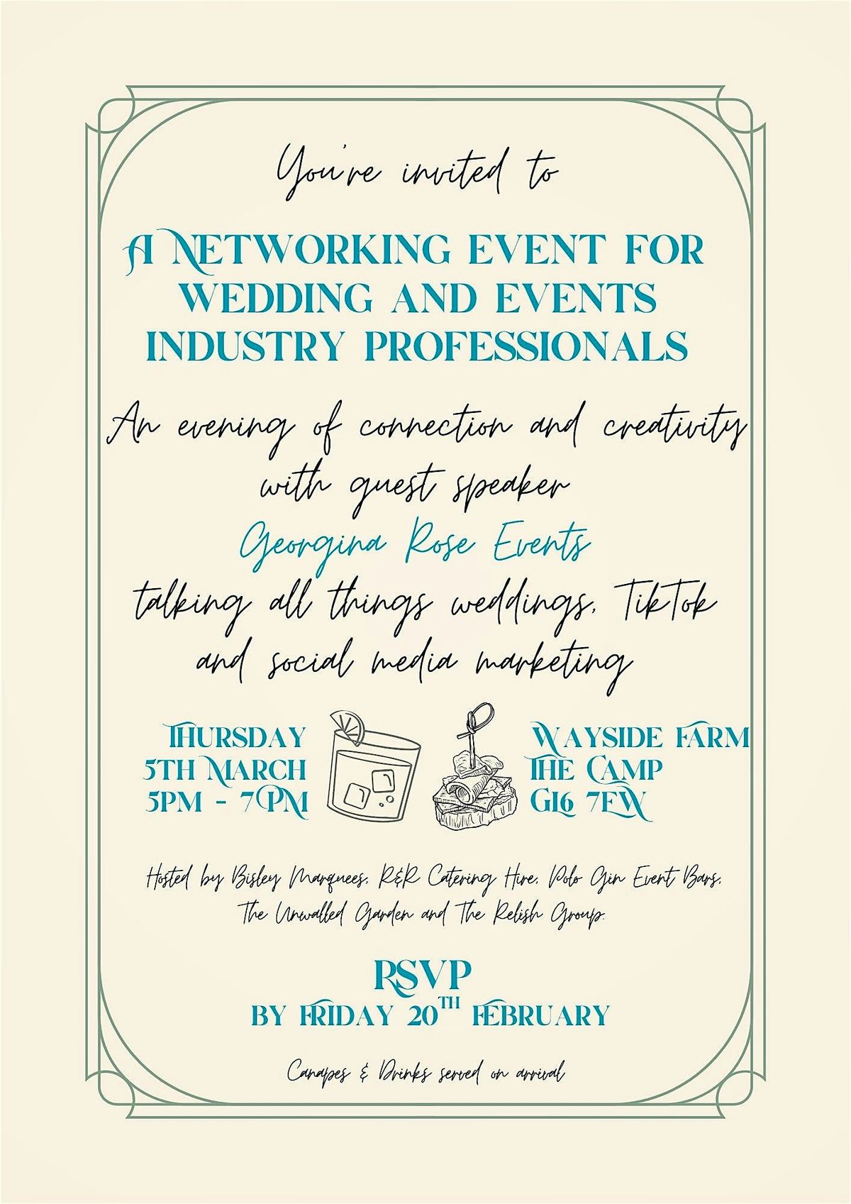 A wedding and events industry suppliers networking evening hosted in partnership by Bisley Marquees, The Unwalled Garden, Relish Event Catering, R&R Catering Hire and British Polo Gin. Taking place at the Bisley Marquees Open Event marquee at Wayside Farm, The Camp, GL6 7EW.
