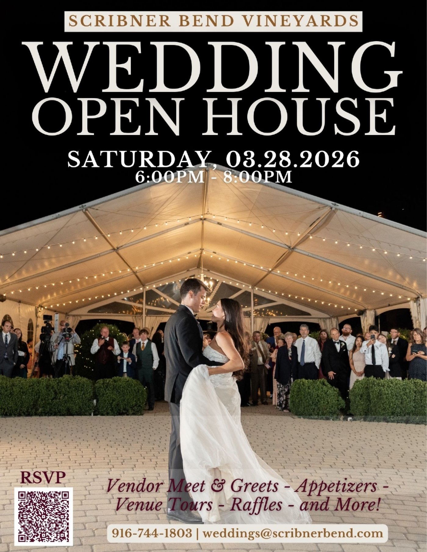 You’re invited to an exclusive Wedding Open House at Scribner Bend Vineyards on Saturday, March 28th, 2026 from 6:00pm-8:00pm. Experience firsthand the elegance, charm, and possibilities that make our venue the perfect backdrop for your special day.