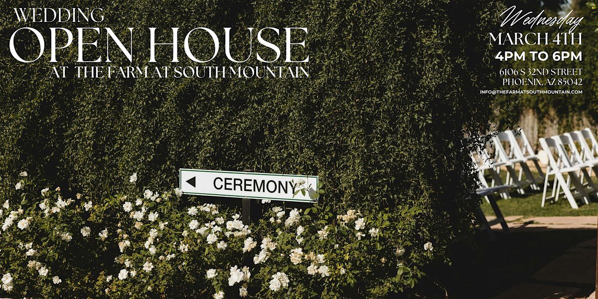 Welcome to the Wedding Open House at The Farm at South Mountain! Join us for a day filled with wedding inspiration and beautiful scenery. Whether you're recently engaged or finalizing your wedding details, this event is perfect for you. Explore our stunning venue, and envision your dream wedding day. We can't wait to help make your special day unforgettable!