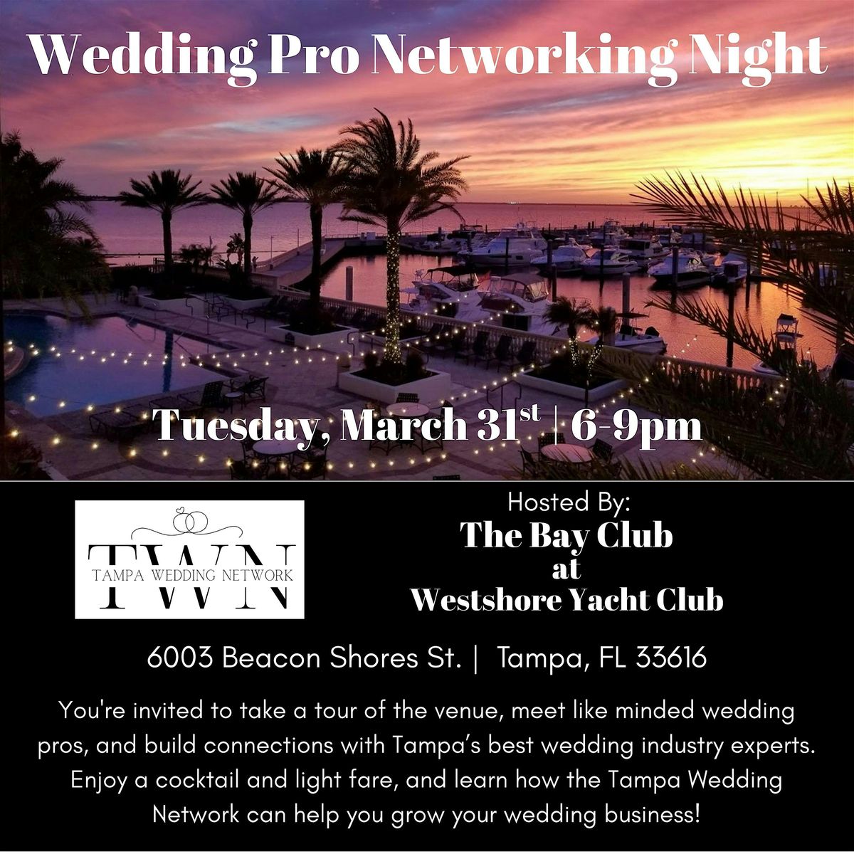 Welcome to the Wedding Pro Networking Night! Join us at The Bay Club at Westshore Yacht Club for an evening of mingling, connecting, and collaborating with fellow wedding professionals. This in-person event is the perfect opportunity to expand your network, share ideas, and build relationships in the wedding industry. Whether you're a photographer, florist, planner, or any other wedding pro, this event is for you! Don't miss out on this fantastic chance to grow your business and make valuable connections!