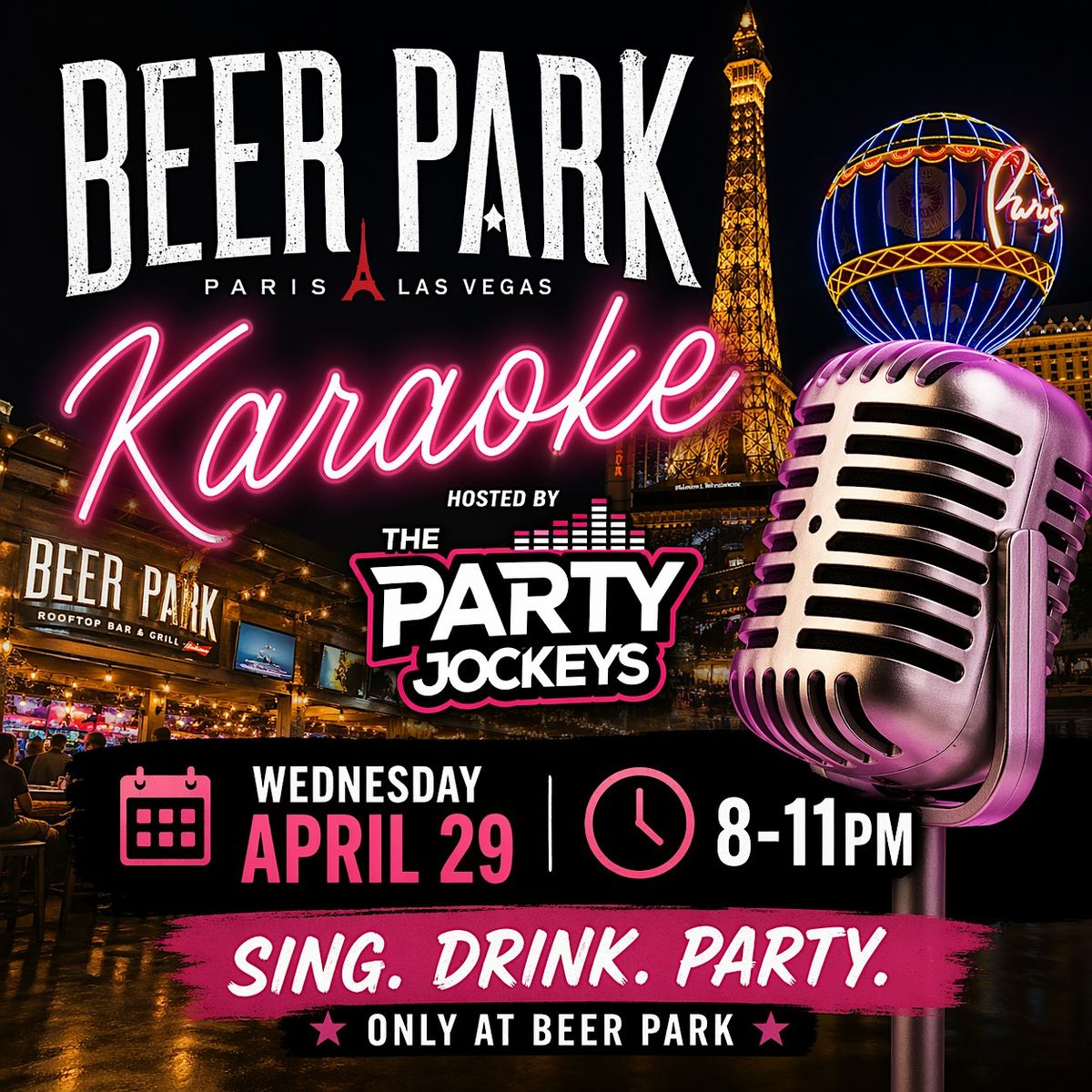 Sing your heart out every Wednesday at Beer Park Karaoke—rooftop vibes, Strip views, and nonstop fun!