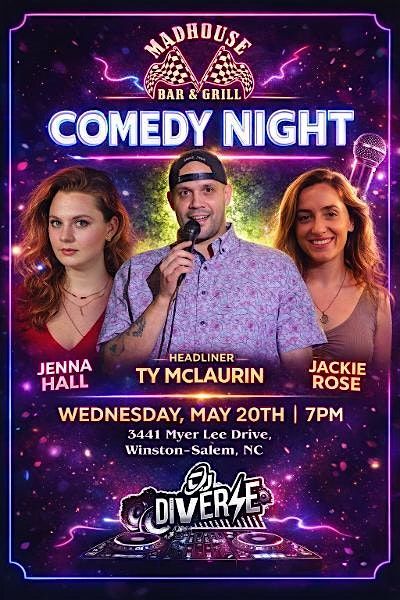 Get ready to laugh until you cry at Madhouse Bar and Grill's first every live comedy show. DJ Diverse will play old school music before, during, and after the show. Jackie Rose (Charleston, SC) and Jenna Hall (Greensboro, NC) will open up for Winston-Salem's very own, nationally touring comedian Ty McLaurin! This will be a night you dont want to miss!