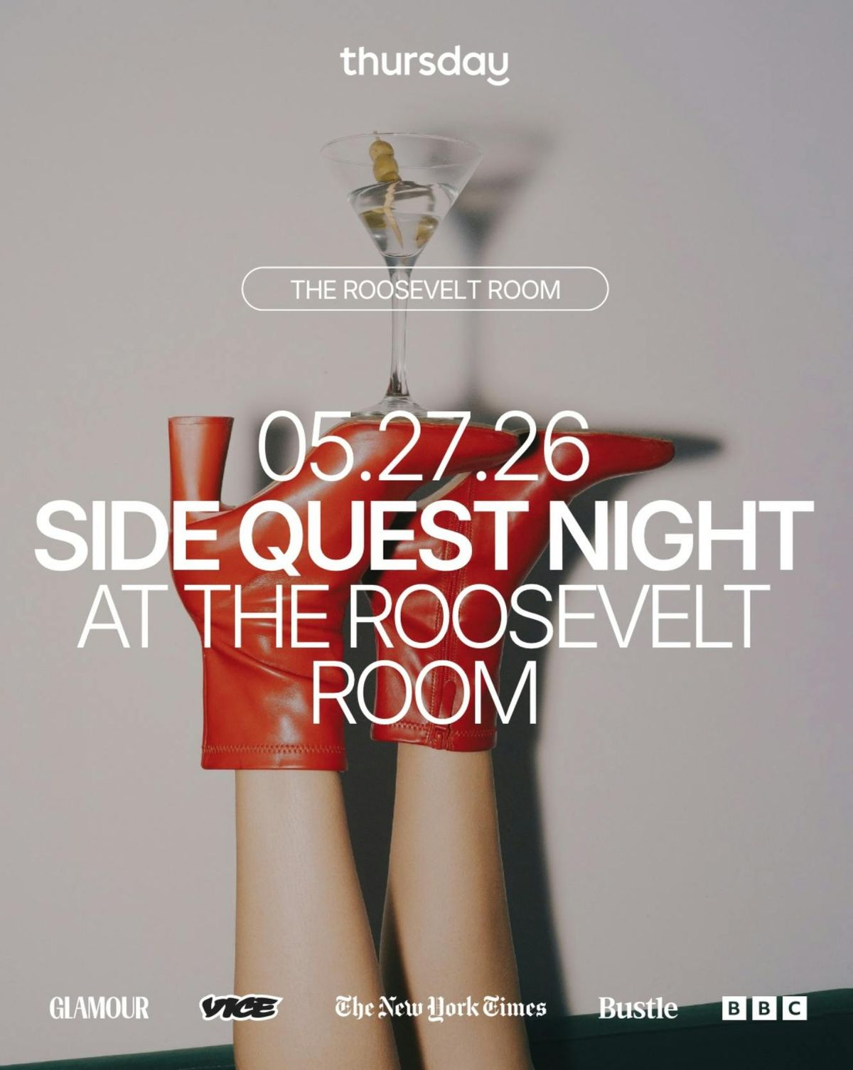 Join us at The Roosevelt Room for Side Quest Night 🤍Skip the awkward intros—we’ve got your side quest ready. Every guest gets a side quest at the door, because meeting someone new should feel like part of the adventure. Are you ready? 👀One venue. Everyone single. No swiping, no ghosting, just real humans in real life. Sparks highly likely.