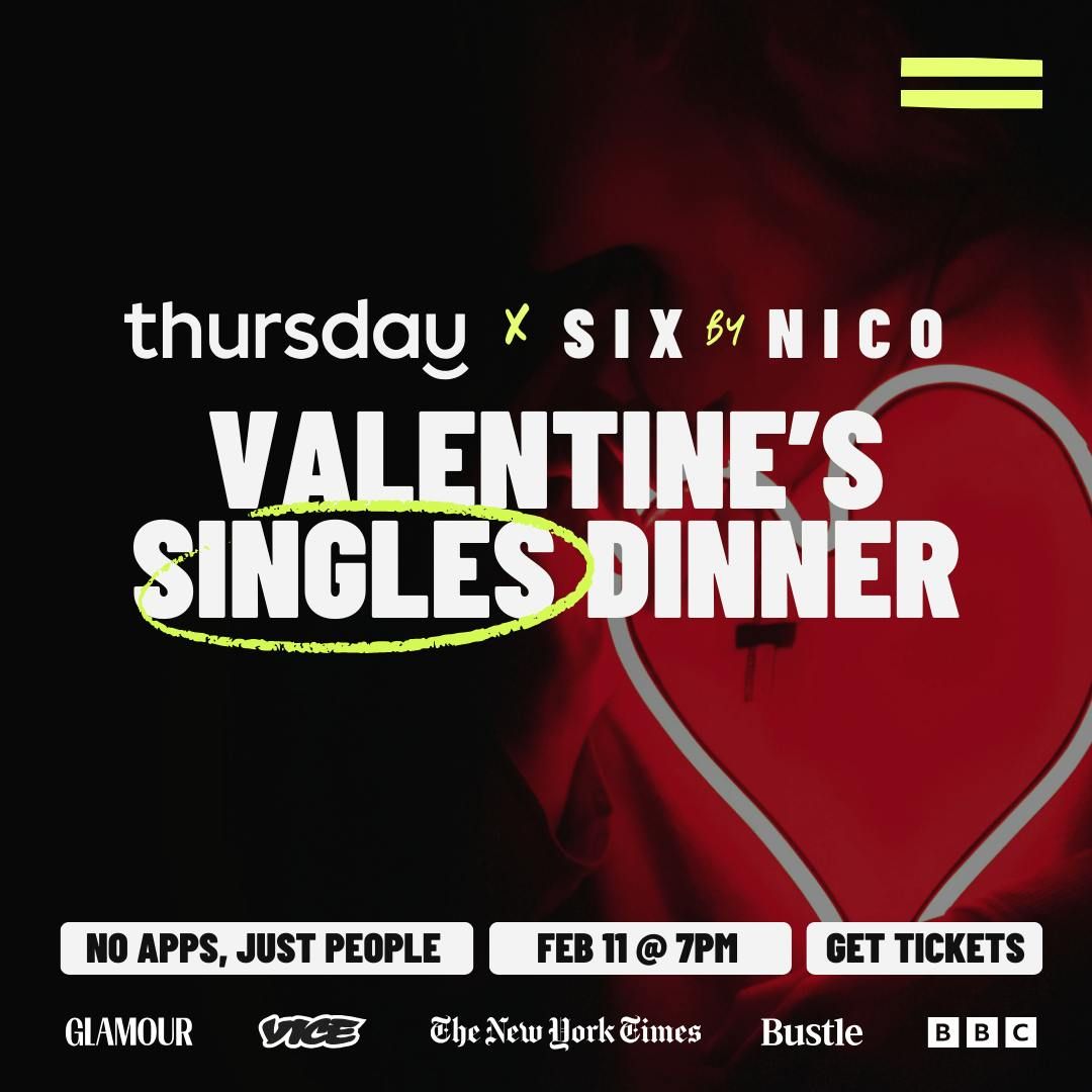 Thursday and Six by Nico are teaming up for a Valentine’s week special that flips the script on dating nights. No speed dating. No forced one on ones. Just incredible food, great people, and a setting that makes conversation flow without trying too hard.This is what Thursday is about. Getting people out of their heads and into real life. Less swiping energy, more eye contact energy. Finally something fun for singles for Valentine's without it feeling forced, awkward or "too" eager.