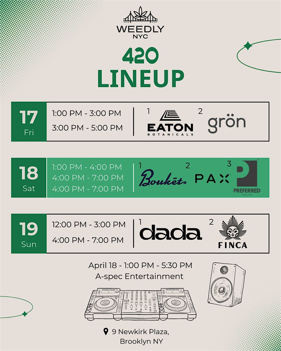 Celebrate 420 by experiencing a lineup of 7 of your favorite brands through the long weekend! Come enjoy the festivities!