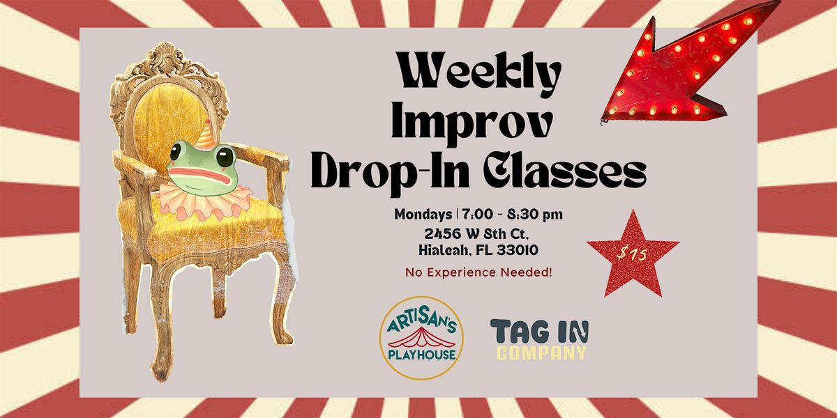 Join us every Monday night for an energizing, laugh-filled improv drop-in class at Artisan’s Playhouse in Hialeah. Whether you’ve never stepped on a stage before or you’ve been improvising for years, this class is designed for all levels.