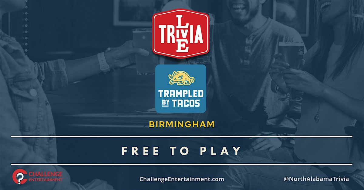 BIRMINGHAM/HWY 280 - NEW GAME NIGHTㅤ#LiveTrivia Weekly, Every WEDNESDAY at 6:30PM at Trampled By Tacos! Starting on 7/9!ㅤDive into the world of knowledge and fun as we gear up for a night of Live Trivia!ㅤBring your A-game and gather that squad for an evening filled with brain-busting questions, laughter, and epic competition.ㅤPrizes await the brightest minds, so make sure your team is ready to conquer the trivia battlefield!ㅤTag your friends, spread the word, and let's make these Live Trivia nights even more memorable than the last!ㅤ#NorthAlabamaTrivia powered by ChallengeEntertainment.com for a #BetterNightOut@therealtrampledbytacos #TriviaInAL #TriviaInBirmingham #TriviaNearMe #WednesdayTrivia @TrampledByTacosTrampled By Tacos - 5363 US-280 Suite B 101, Birmingham, AL