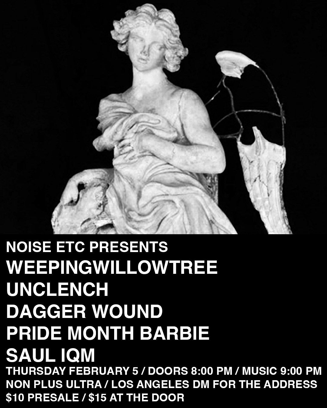 2.5 - 8pm - $10 adv $15 dos - dm @nonplusultrala for address (presale ticket holders will be sent location day of show)