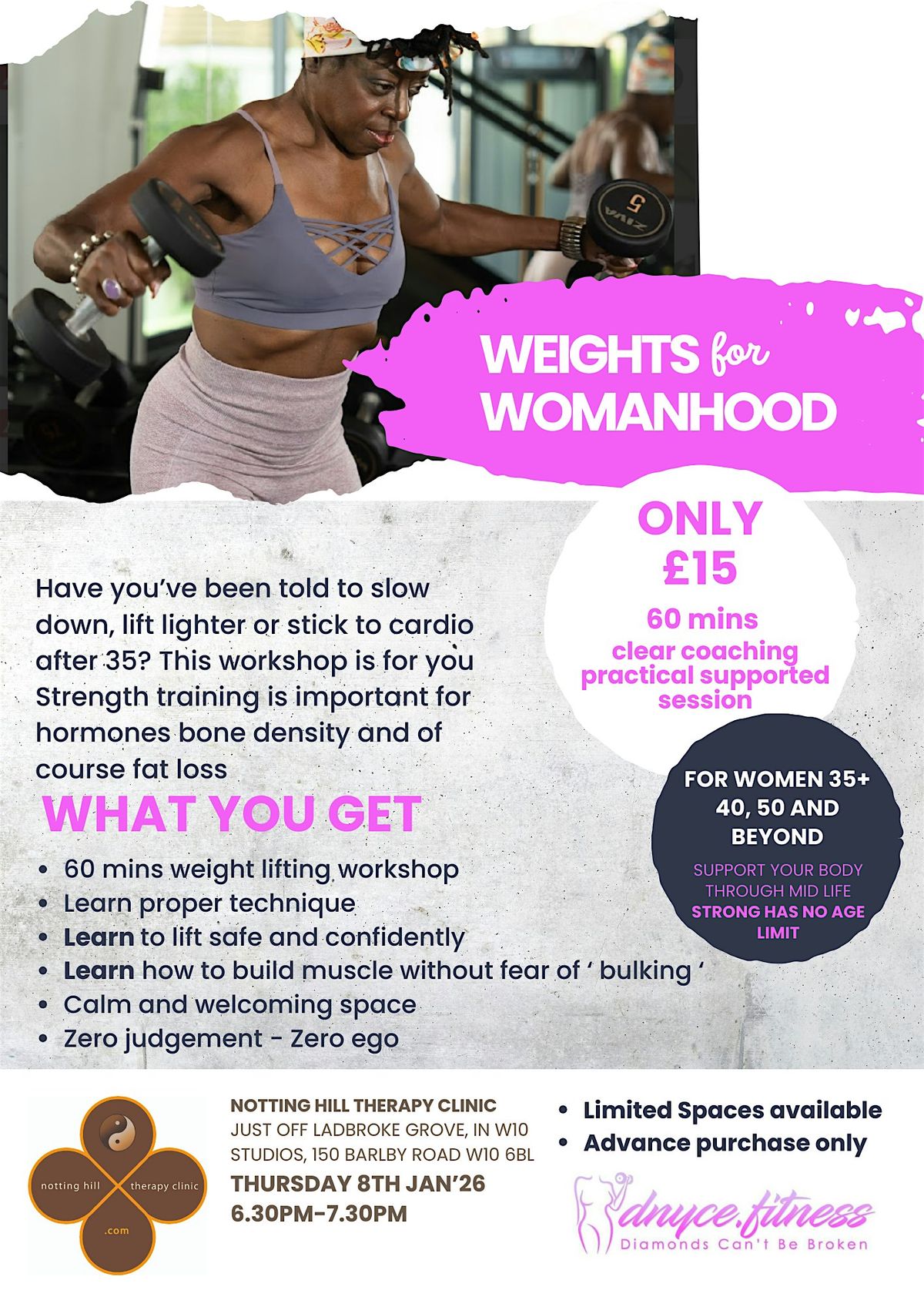Join Denise Campbell [IFBB/NPC amateur Bodybuilder] for Weights for WomanHOOD, an in-person event designed to celebrate strength, sisterhood, and self-love. Whether you're a newbie or a lifting pro, this is your chance to connect, sweat, and lift your spirits along with some serious weights.
