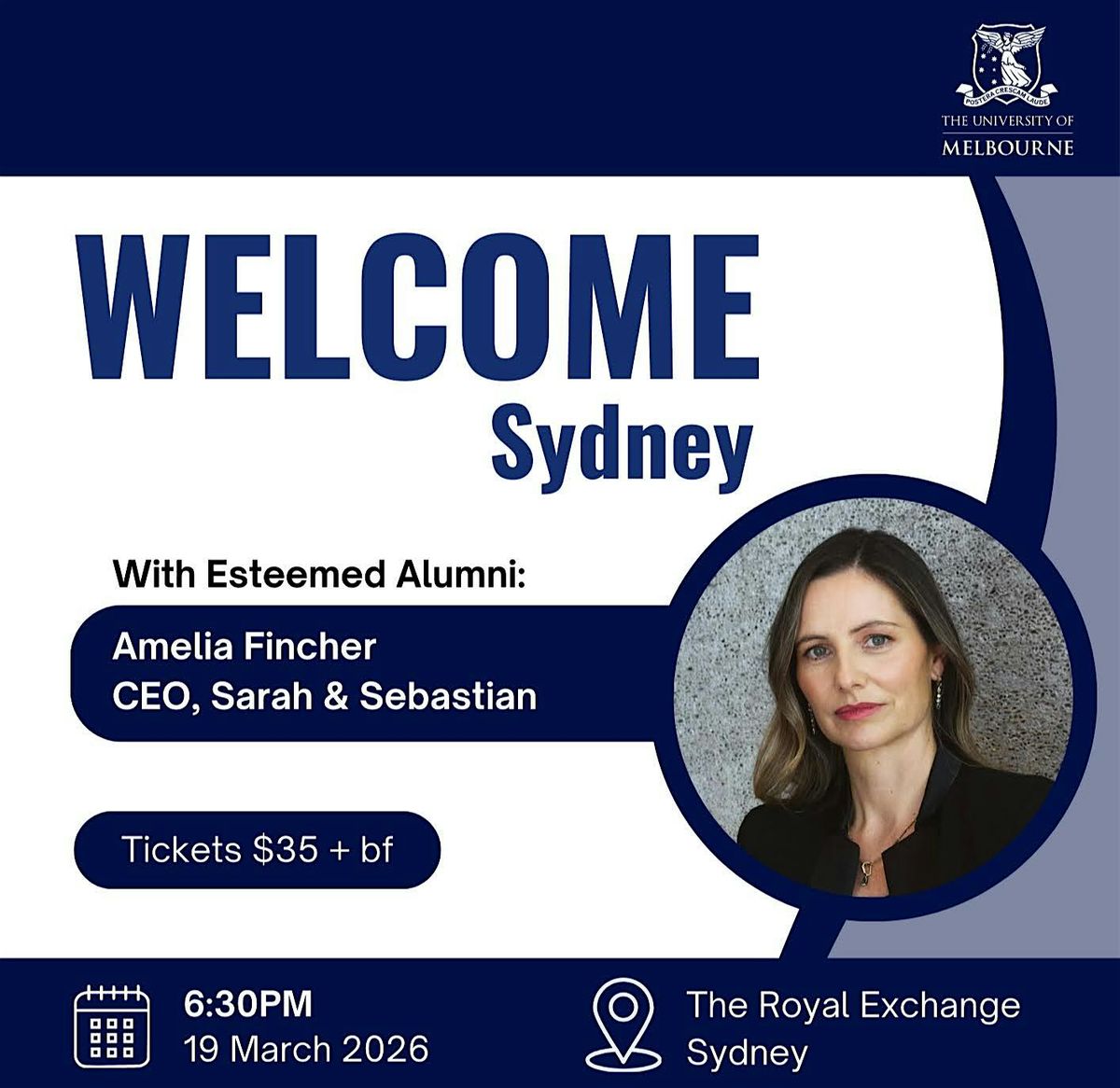We are excited to announce our first flagship event for 2026 - the annual Welcome Sydney event - featuring special guest speaker and esteemed alum, Amelia Fincher.Amelia is currently the CEO of SARAH & SEBASTIAN. Prior to this, she has held various senior leadership roles at MECCA Brands, Dion Lee and Mulberry (UK), following an investment banking career at Macquarie and JP Morgan. She also holds an MBA from ESSEC Business School in Paris and First Class Honours in Finance from the University of Melbourne.Join us to welcome our newest graduates moving to Sydney, reconnect with fellow alumni, and enjoy light refreshments.All alumni are welcome, whether you graduated last year or 20 years ago.Seats are limited, so make sure to register below. We hope to see you there!