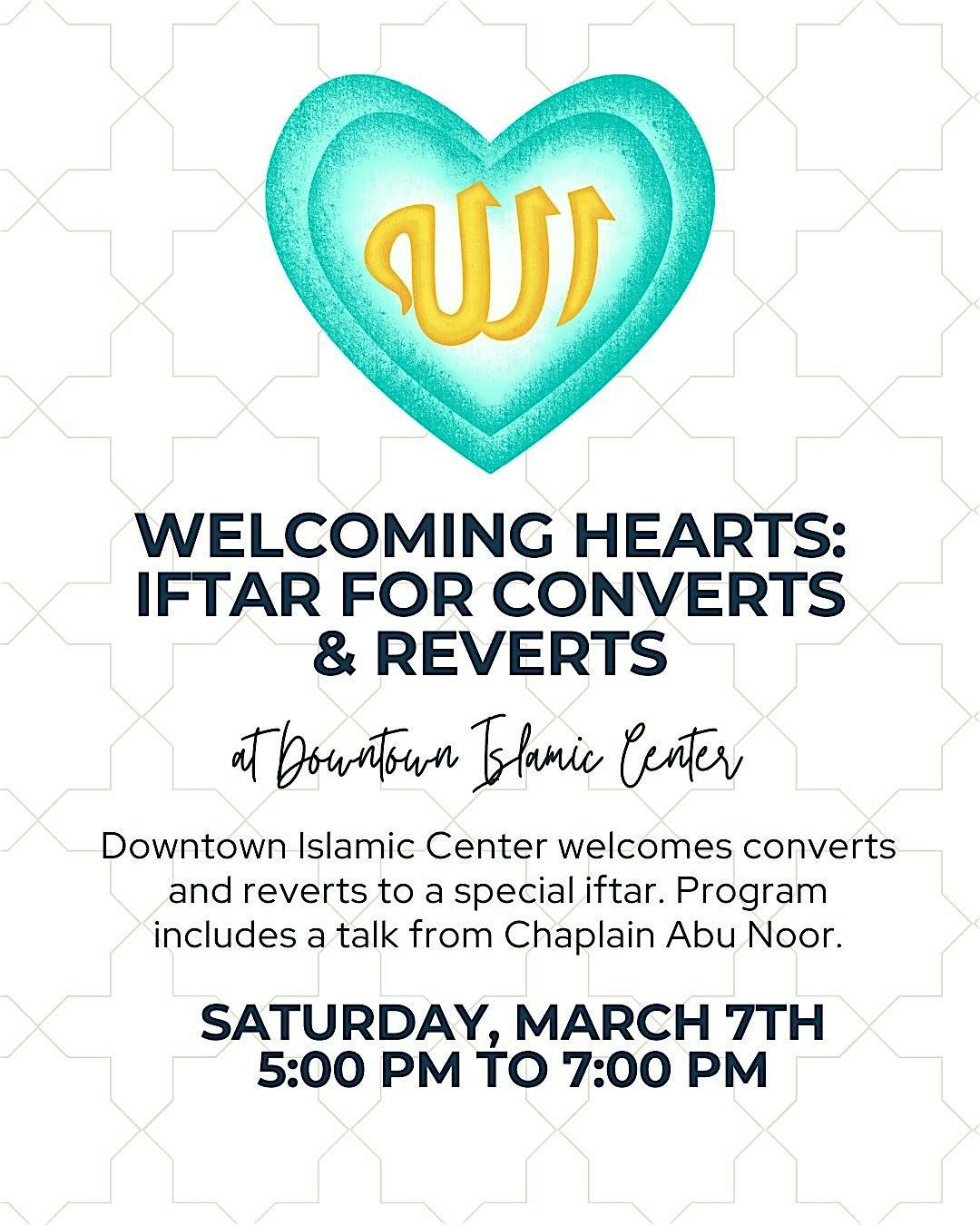 Downtown Islamic Center welcomes converts and reverts to a special iftar. Program includes a talk from Chaplain Abu Noor.