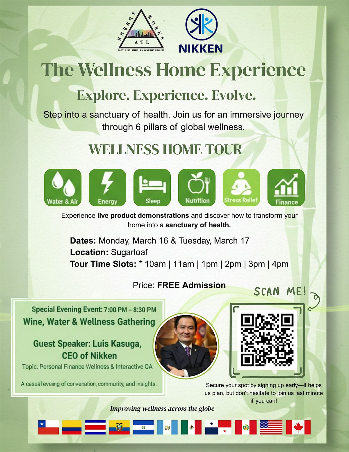 - The Evening Keynote (7:00 PM – 8:30 PM): Join us for "Wine, Water & Wellness," featuring a special presentation by Luis Kasuga, CEO of Nikken, on the vital connection between personal finance and overall wellness.