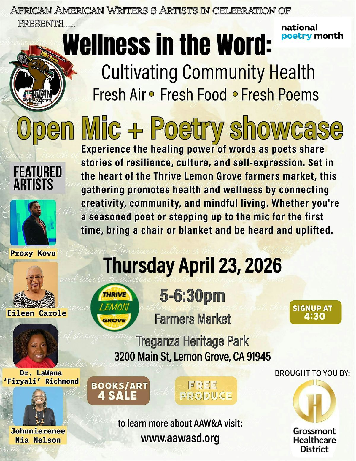 Join us for an inspiring afternoon of poetry, community, and wellness at the Lemon Grove Farmers Market! In celebration of National Poetry Month, Wellness in the Word: Cultivating Community Health brings together local voices for a vibrant open mic and a powerful featured poet performance.