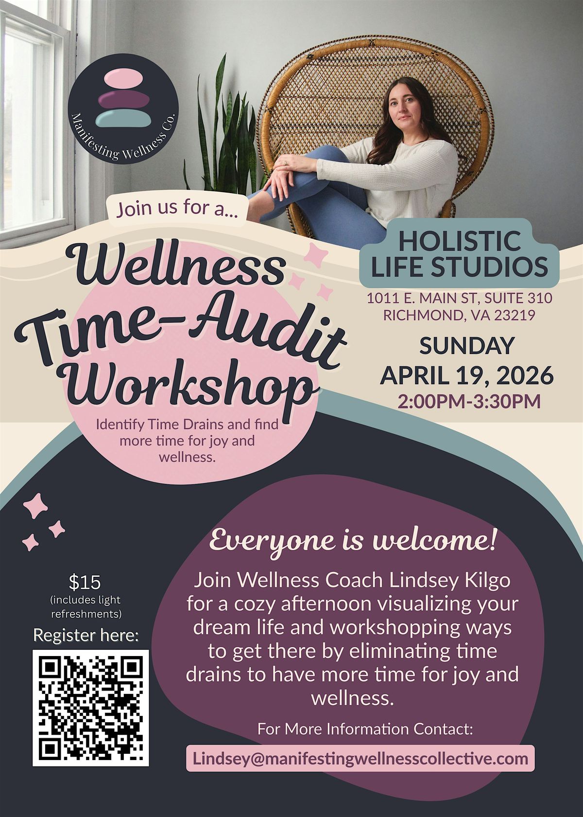 Info: Lindsey will guide the group to identify time drains and make changes to become more efficient in order to create more time for wellness and work towards your dream life schedule.