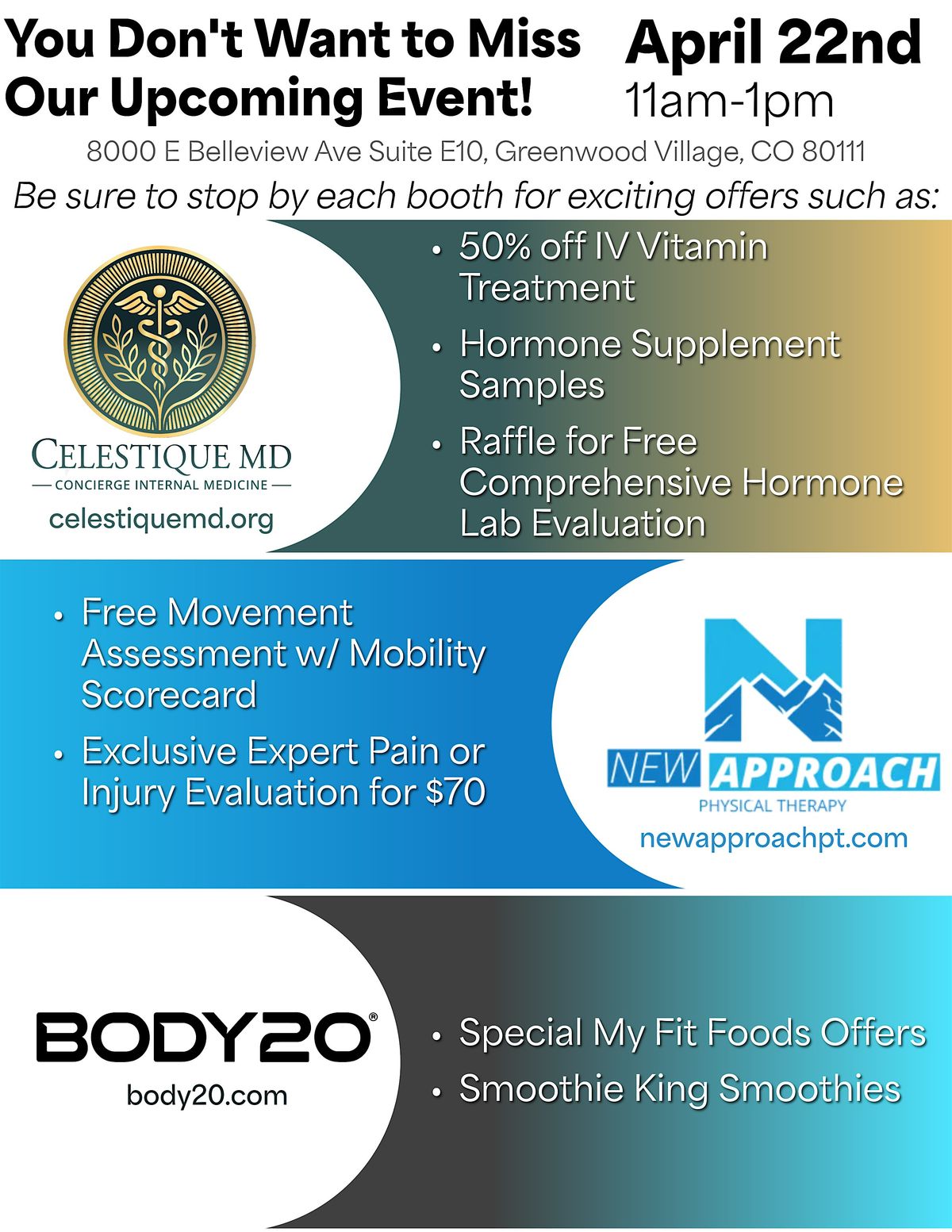 We are excited to invite you to an upcoming event featuring a variety of health and wellness resources. Be sure to stop by each booth to explore these exciting offers and services: