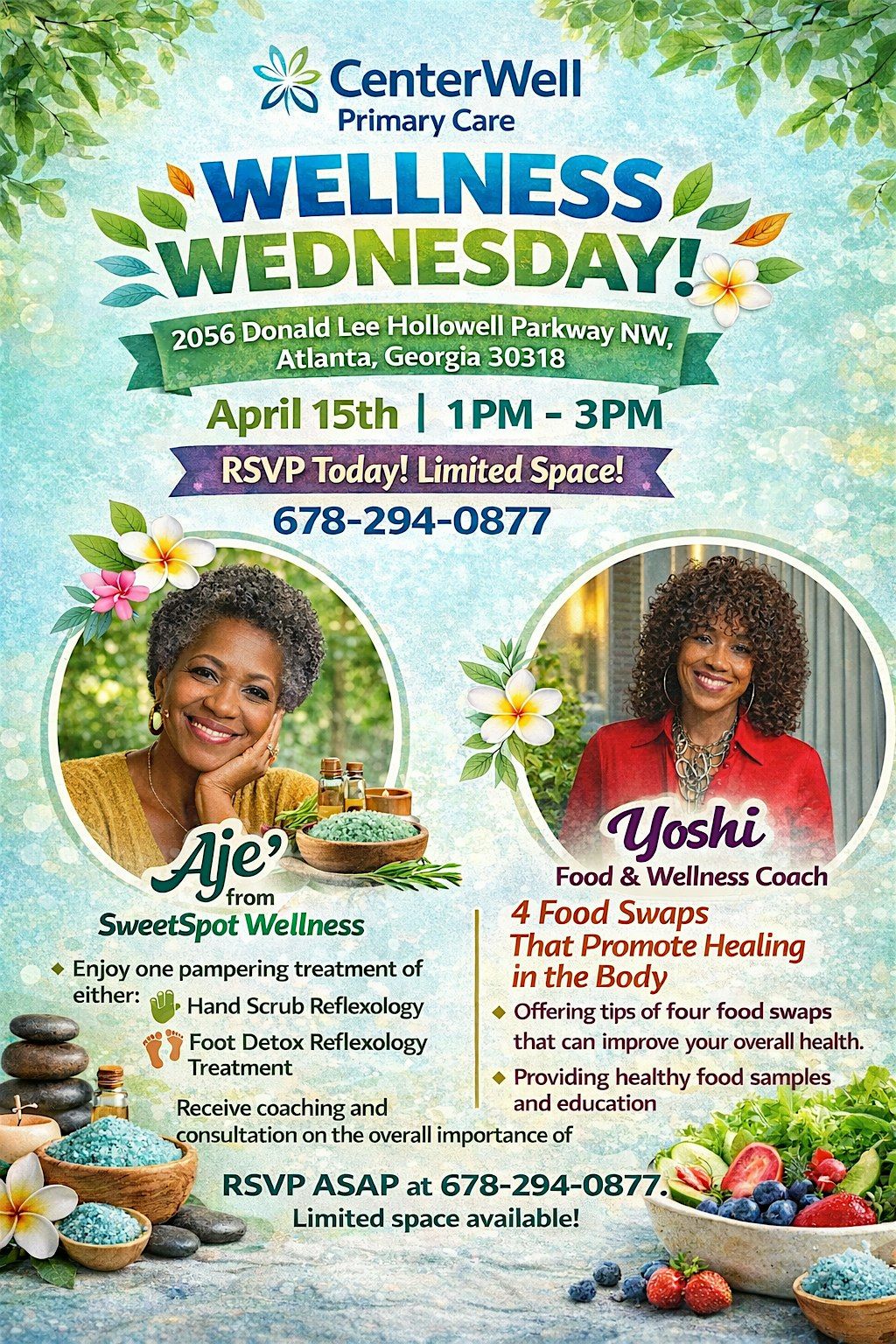 Come join us for Wellness Wednesday, an awesome FREE in-person event where you can relax, recharge, and connect with like-minded folks. Whether you're into meditation, or just chill vibes, this is the perfect midweek pick-me-up. Don't miss out on a day filled with good energy, spa-like relaxation,education, healthy eats and great company. See you there!