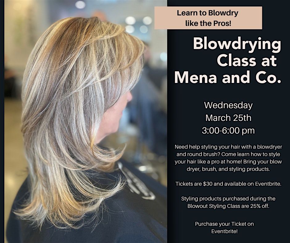 Ready to master the art of the perfect blowout? Join our in-person blowdrying class at Mena and Co. Salon! Whether you're a newbie or just want to up your hair game, this fun and hands-on session will have you styling like a pro in no time. Don’t miss out on learning the tips and tricks to get that flawless, voluminous look. See you there!