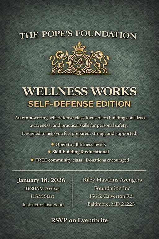 Welcome to Wellness Works: Self Defense! Join us at 156 S Calverton Rd on January 18, 2026 at 11:00 AM (Eastern Time) for a fun and empowering self-defense workshop. Learn essential techniques to boost your confidence and stay safe. No experience necessary, just come ready to learn and have a great time! This is a FREE class however donations are strongLu encouraged so we can continue to host this monthly wellness series! See you there!