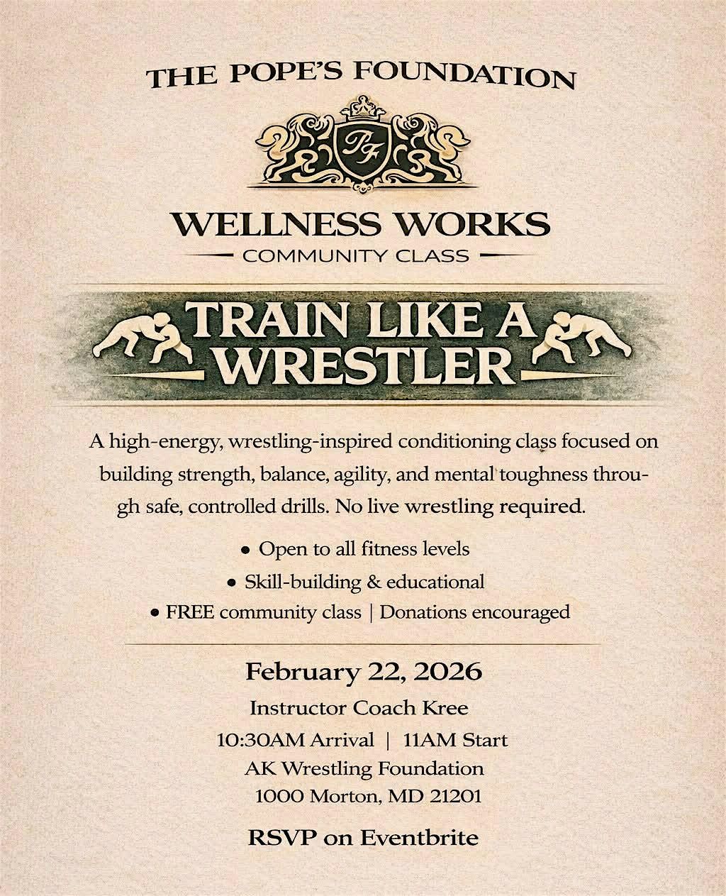 Join Coach Klee for an energy, wrestling inspired conditioning class, focused on building strength, balance, agility, and mental toughness through safe, control drills. No live wrestling is required. Open to all fitness levels. This event is focused on skill building in purely educational. This is a free community class however donations are strongly so that The Pope's Foundation can continue to bring these events to the community every month.