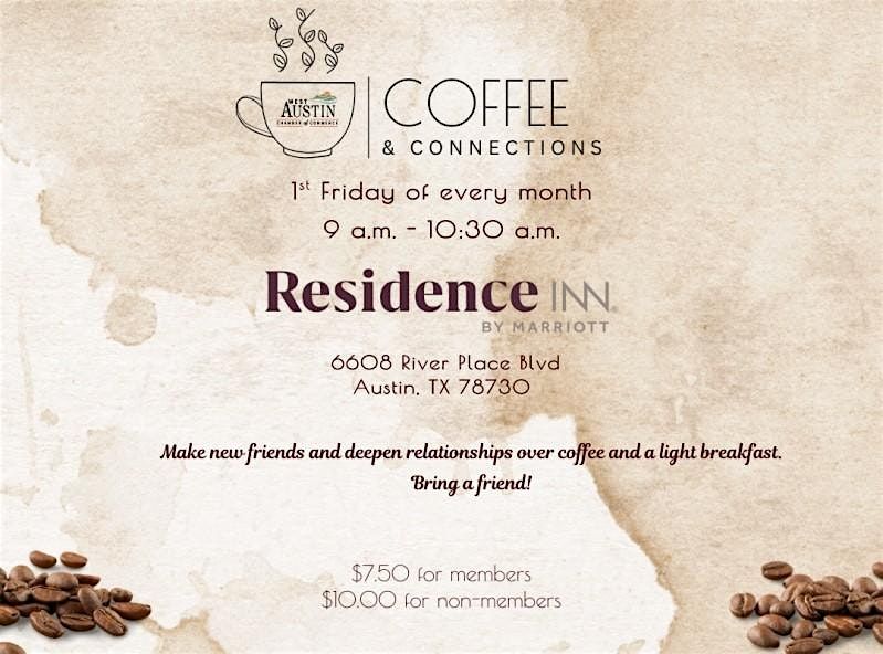 Join the West Austin Chamber for Coffee & Connections. This monthly gathering brings together a high-quality mix of local professionals, business owners, and community leaders—all in a relaxed, welcoming environment.