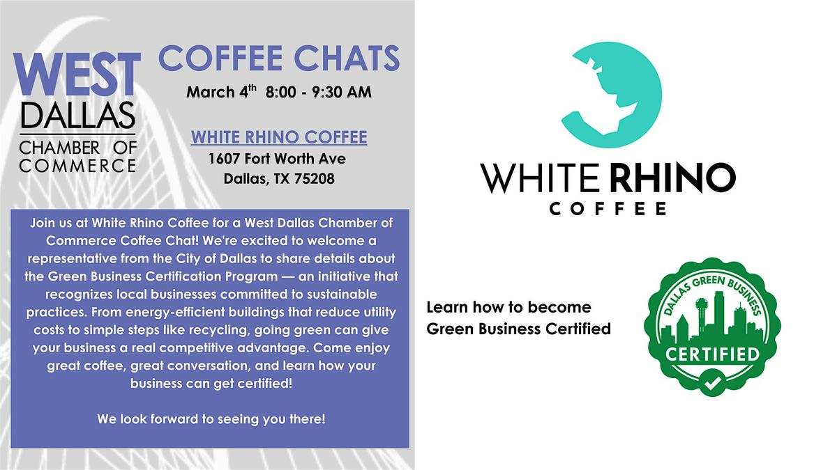 Join the West Dallas Chamber of Commerce for our monthly Coffee Chat on Tuesday, March 4th from 8:00–9:30 AM at White Rhino Coffee!