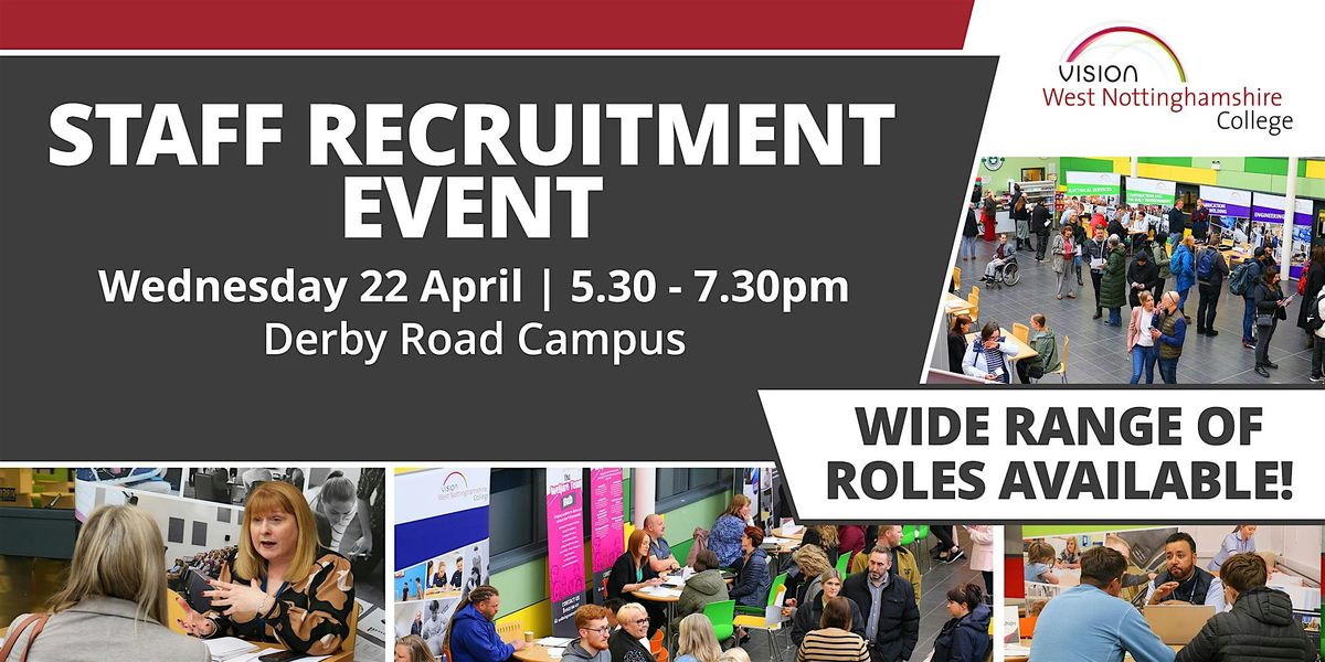 Join us at our recruitment event on Wednesday 22 April 2026 5.30pm- 7.30pm at our Derby Road Campus, NG18 5BH to explore our facilities, meet our department heads and see for yourself how a role at West Notts College could be the start of your next exciting chapter!