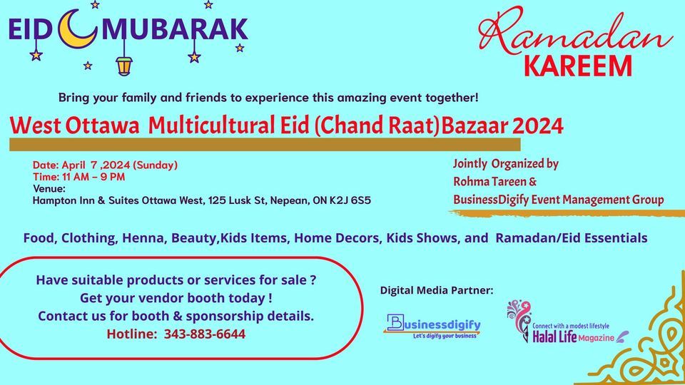 West Ottawa Eid (Chand Raat) Bazaar 2024DON'T MISS OUT! LIMITED VENDOR BOOTHS LEFT AT WEST OTTAWA EID (CHAND RAAT) BAZAAR 2024