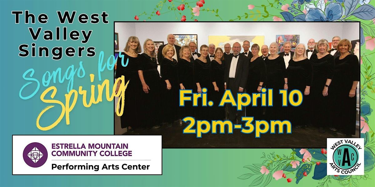 Join the West Valley Singers in celebrating the beautiful season of Spring, with choral pieces, vocal solos and duets, instrumentals, and drama! at the Estrella Mountain Community College Performing Arts Center on Friday, April 10, 2-3pm. Open seating begins at 1:30pm in the PAC's auditorium.