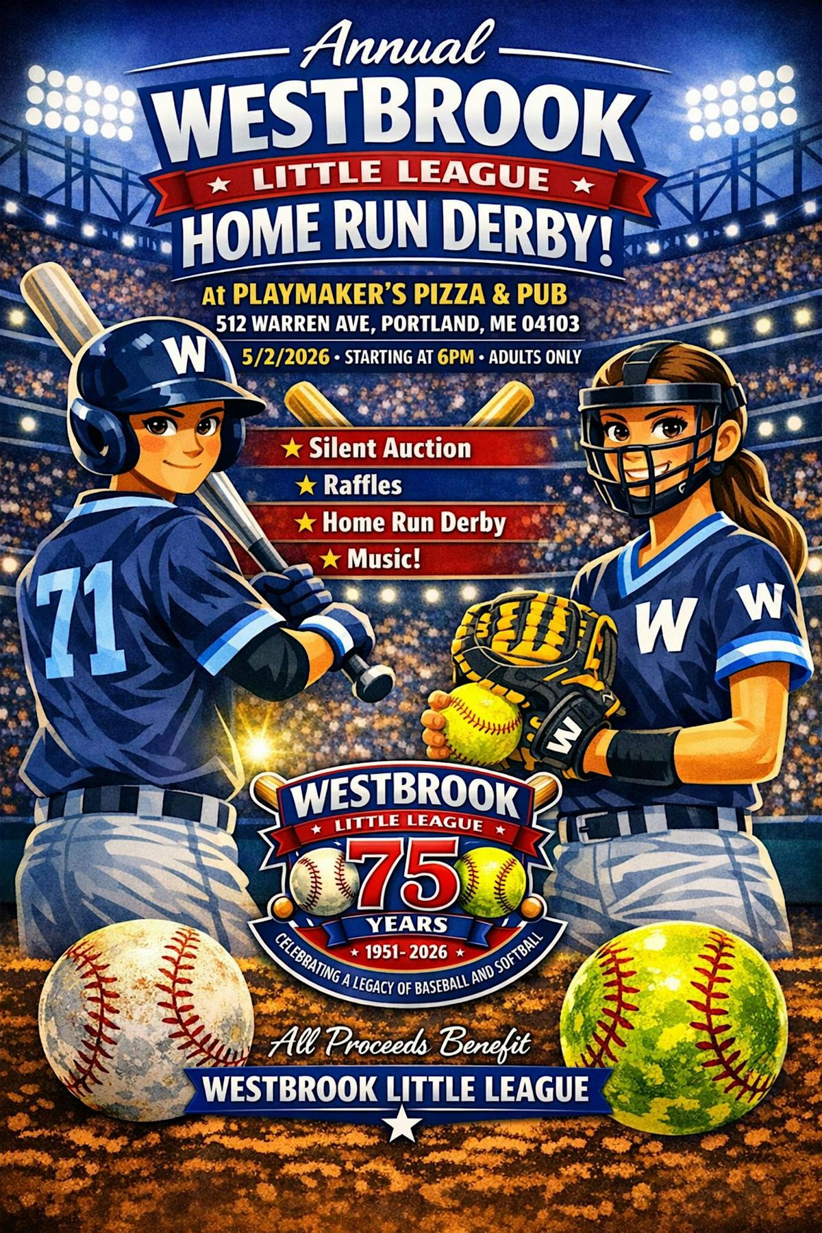 Join us for the Annual Westbrook Little League Home Run Derby as we celebrate 75 years of baseball and softball in our community! 🎉